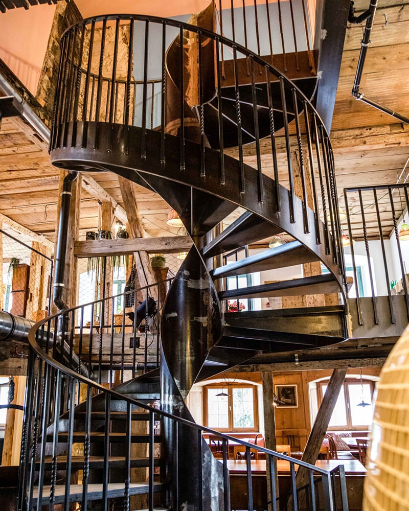 Mehrgeschoßige Wendeltreppe Stahl & Holztritte