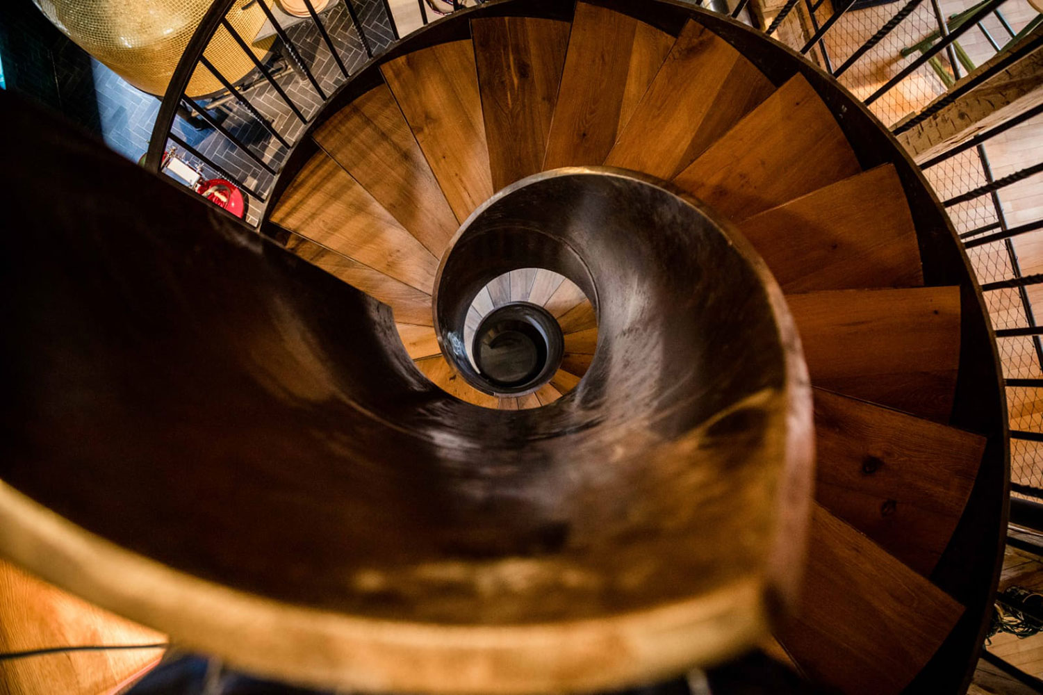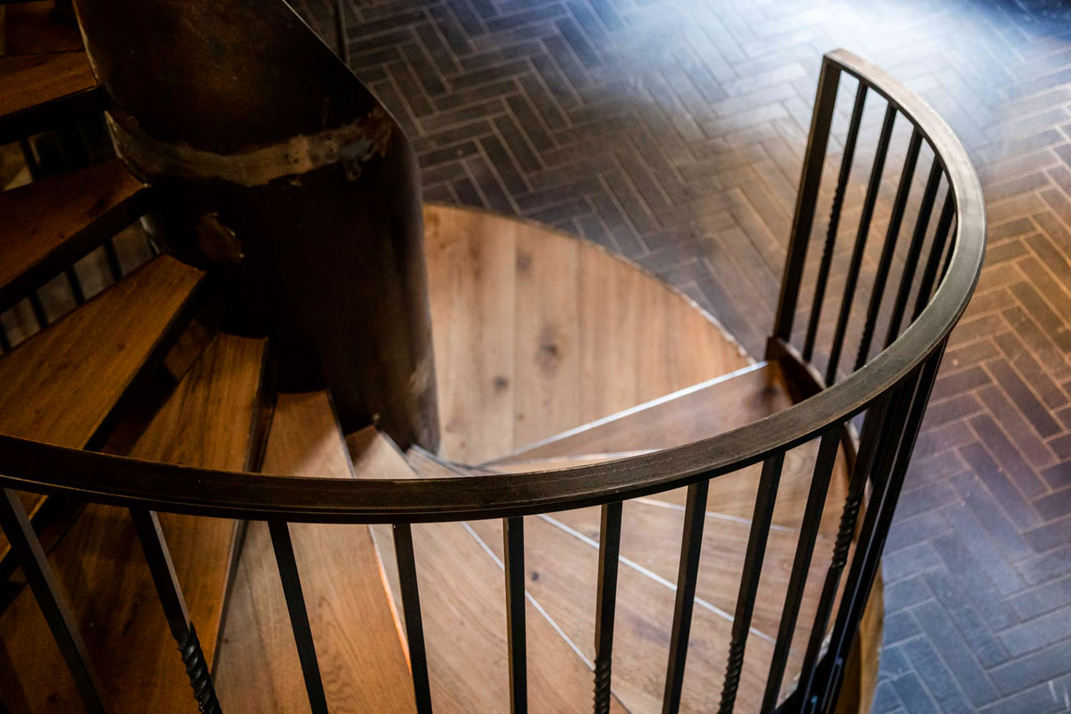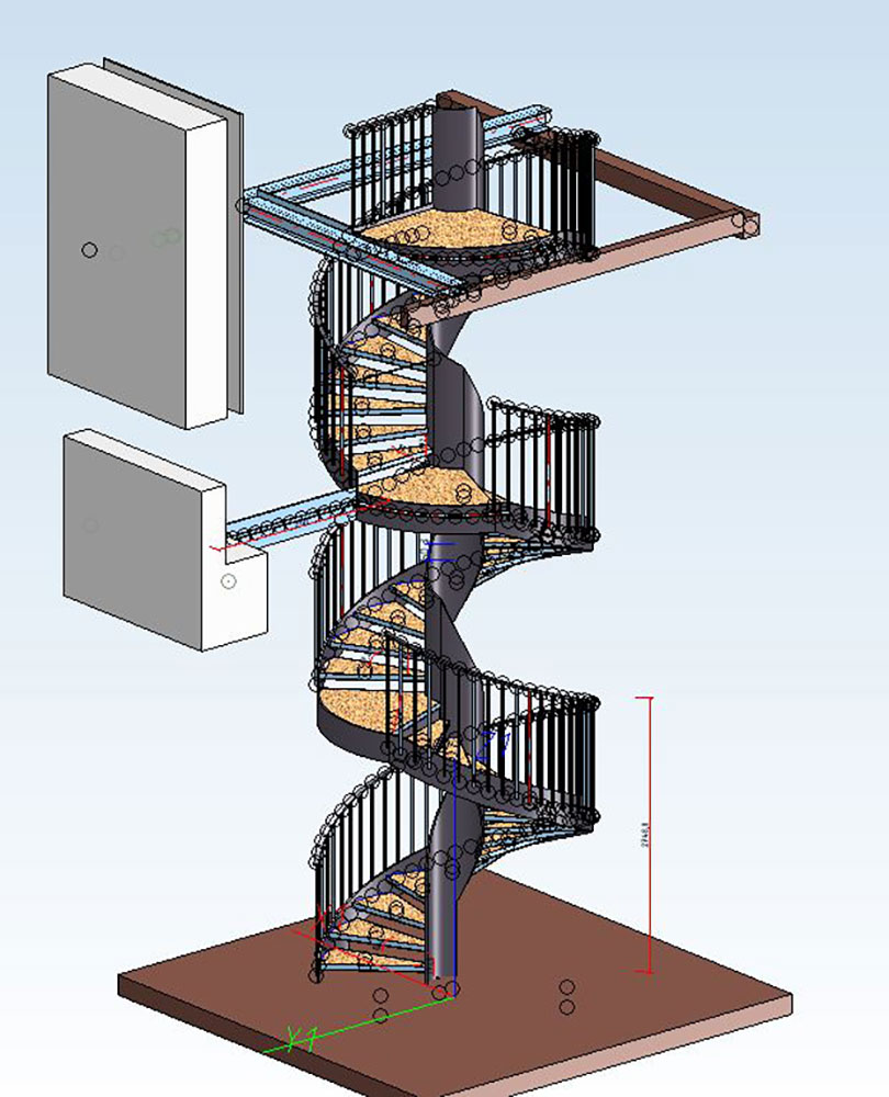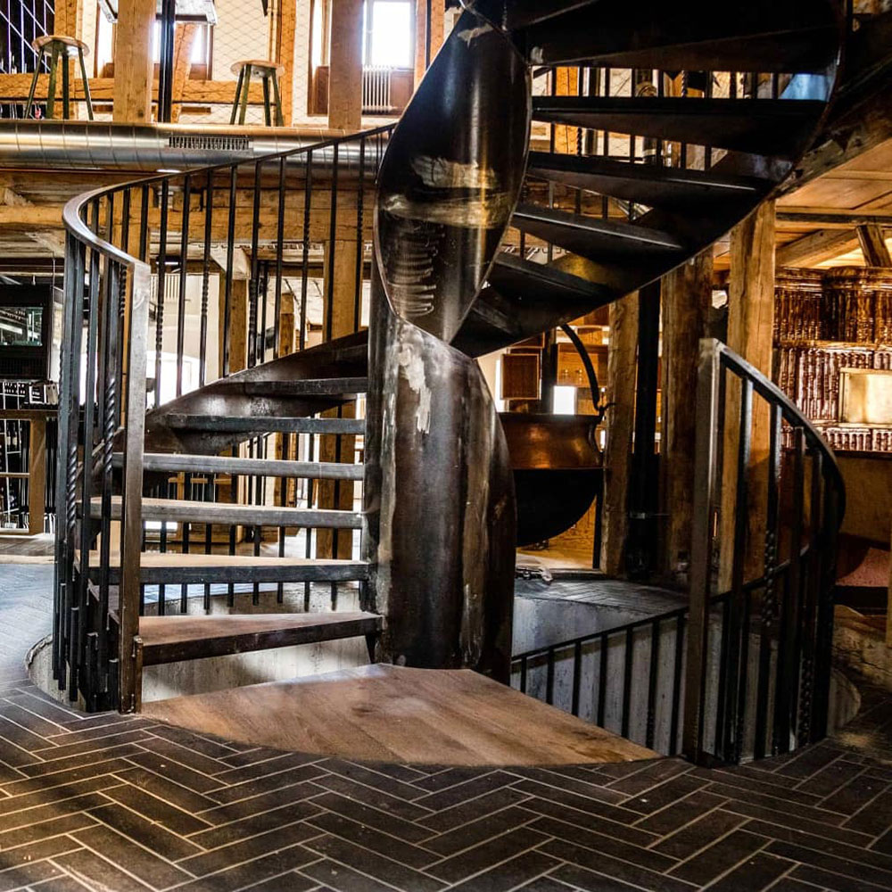 Mehrgeschoßige Wendeltreppe Stahl & Holztritte